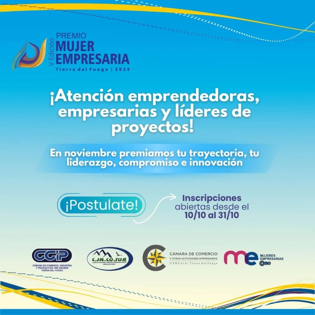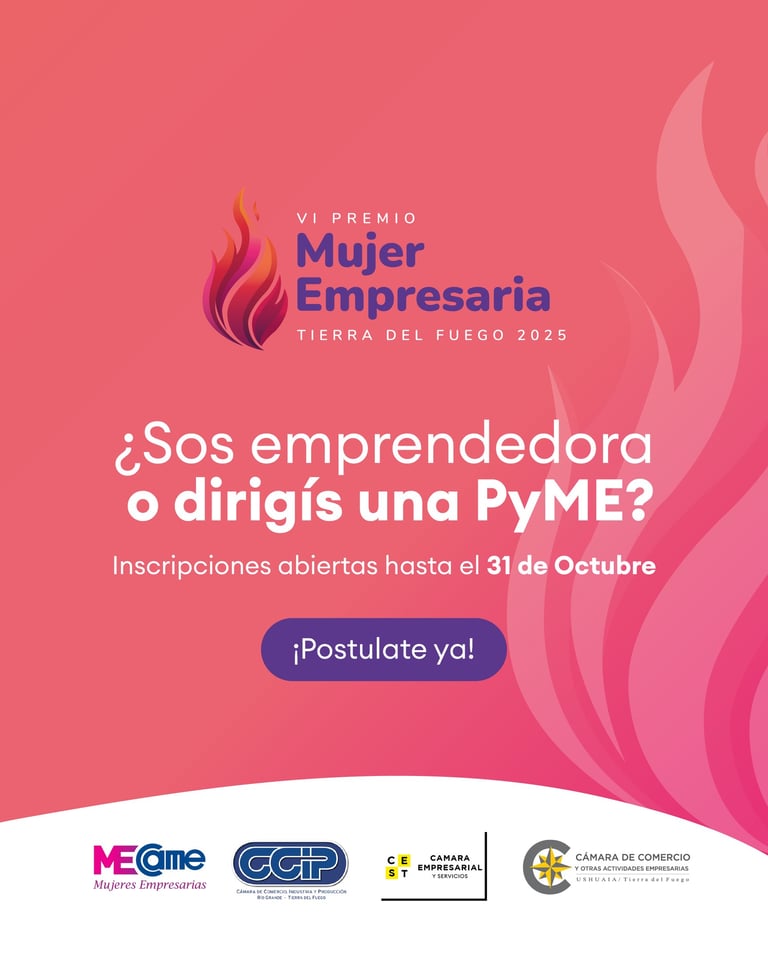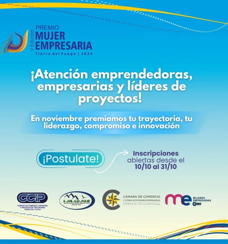 Llega la 5ta edición del "PREMIO MUJER EMPRESARIA Tierra del Fuego 2024", donde buscamos reconocer a mujeres de nuestra provincia destacadas por su trayectoria empresarial, liderazgo y capacidad de innovación, motorizando la economía e inspirando a otras.