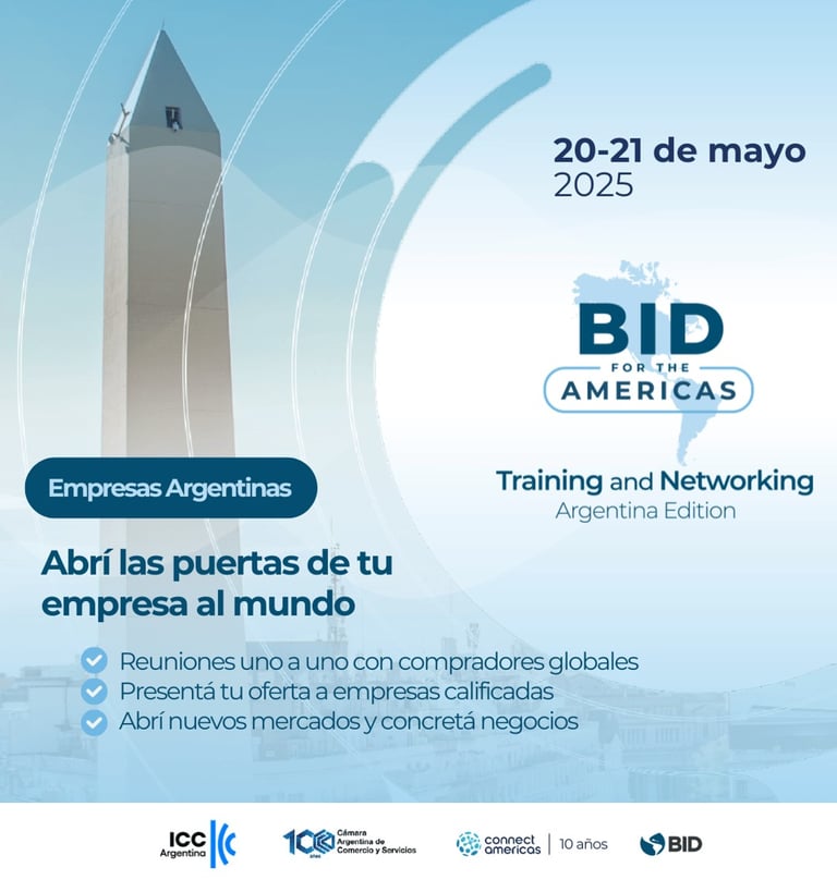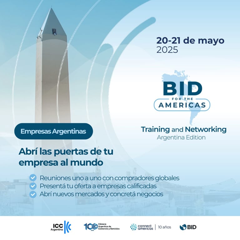 Participá en el Matchmaking B2B de BID for the Americas Training & Networking: Argentina Edition, un evento virtual y gratuito organizado por ConnectAmericas, la plataforma del BID, que te conecta con compradores internacionales interesados en productos y servicios argentinos; y apoyado institucionalmente por la Cámara Argentina de Comercio y Servicios y el Comité argentino de la International Chamber of Commerce.